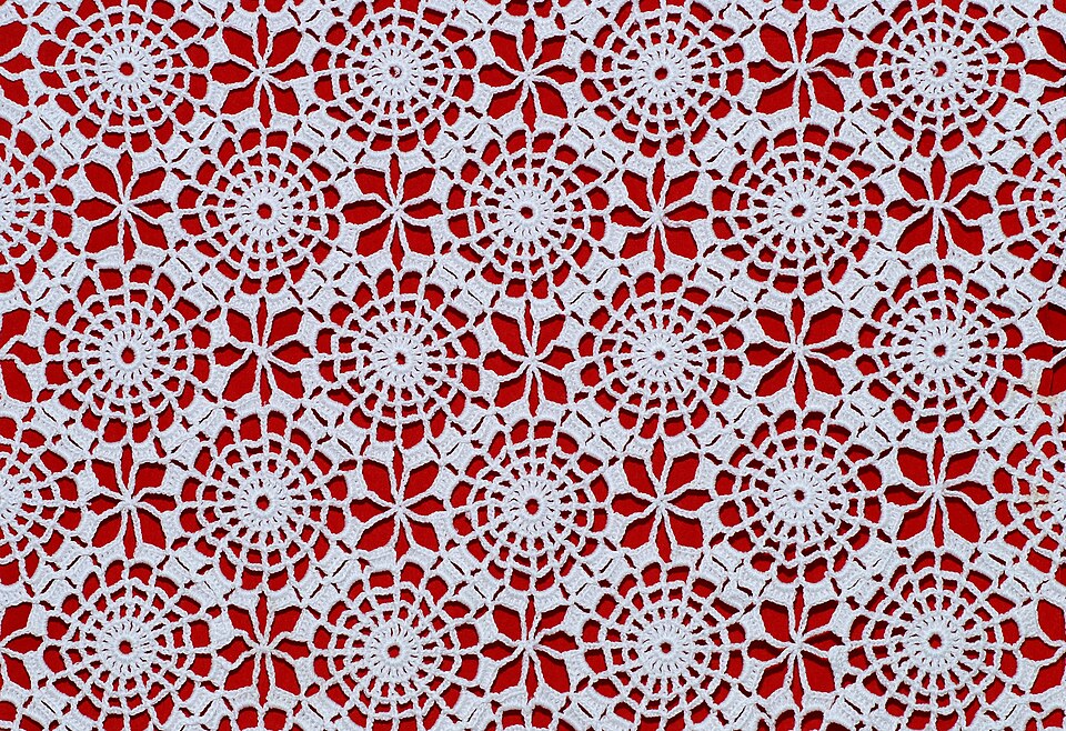Crochet stitches form intricate textiles by interlocking loops with a single hook